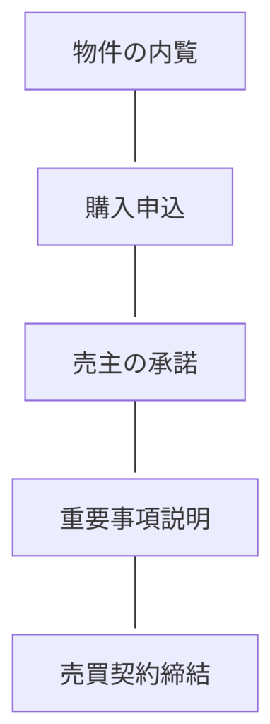 この図からもわかるように、購入申込は契約の前段階であり、売主の承諾があって初めて契約交渉が本格化します。重要事項説明は宅地建物取引業法に基づき、契約前に必ず行われるステップであり、契約書の内容を理解したうえで署名・押印することが求められます。